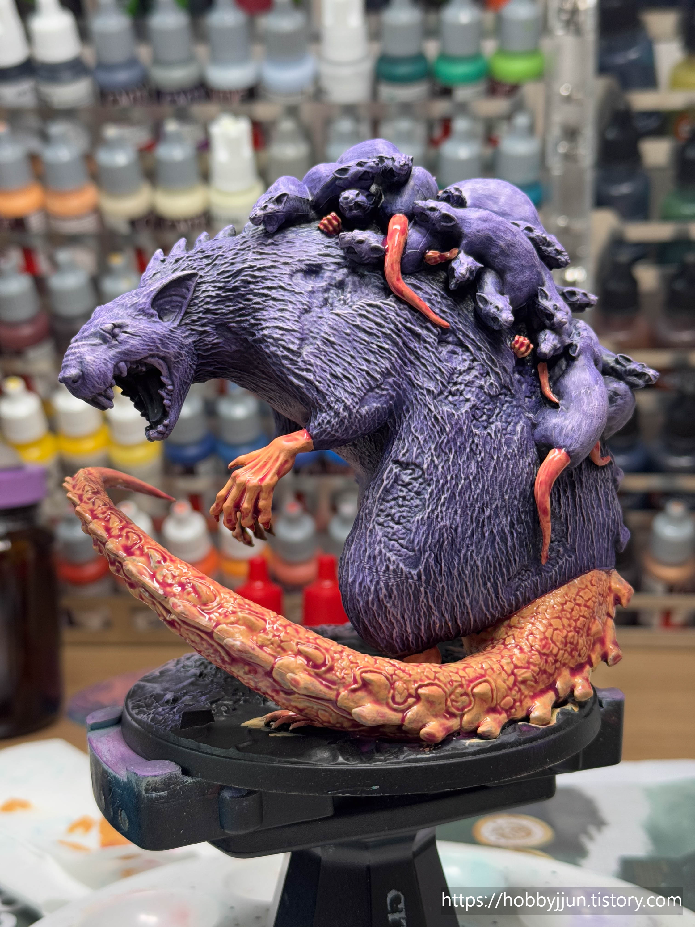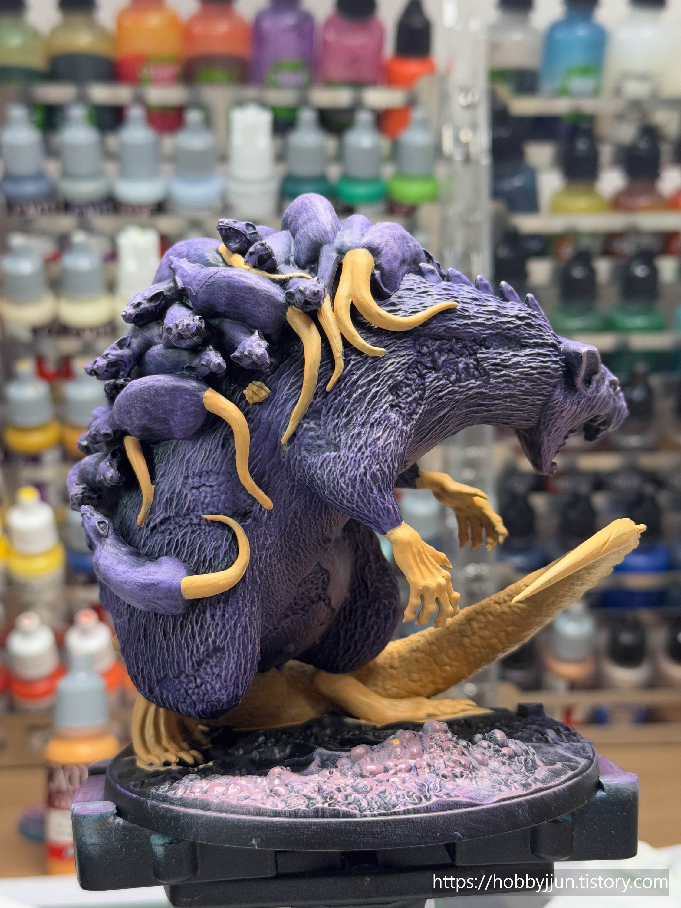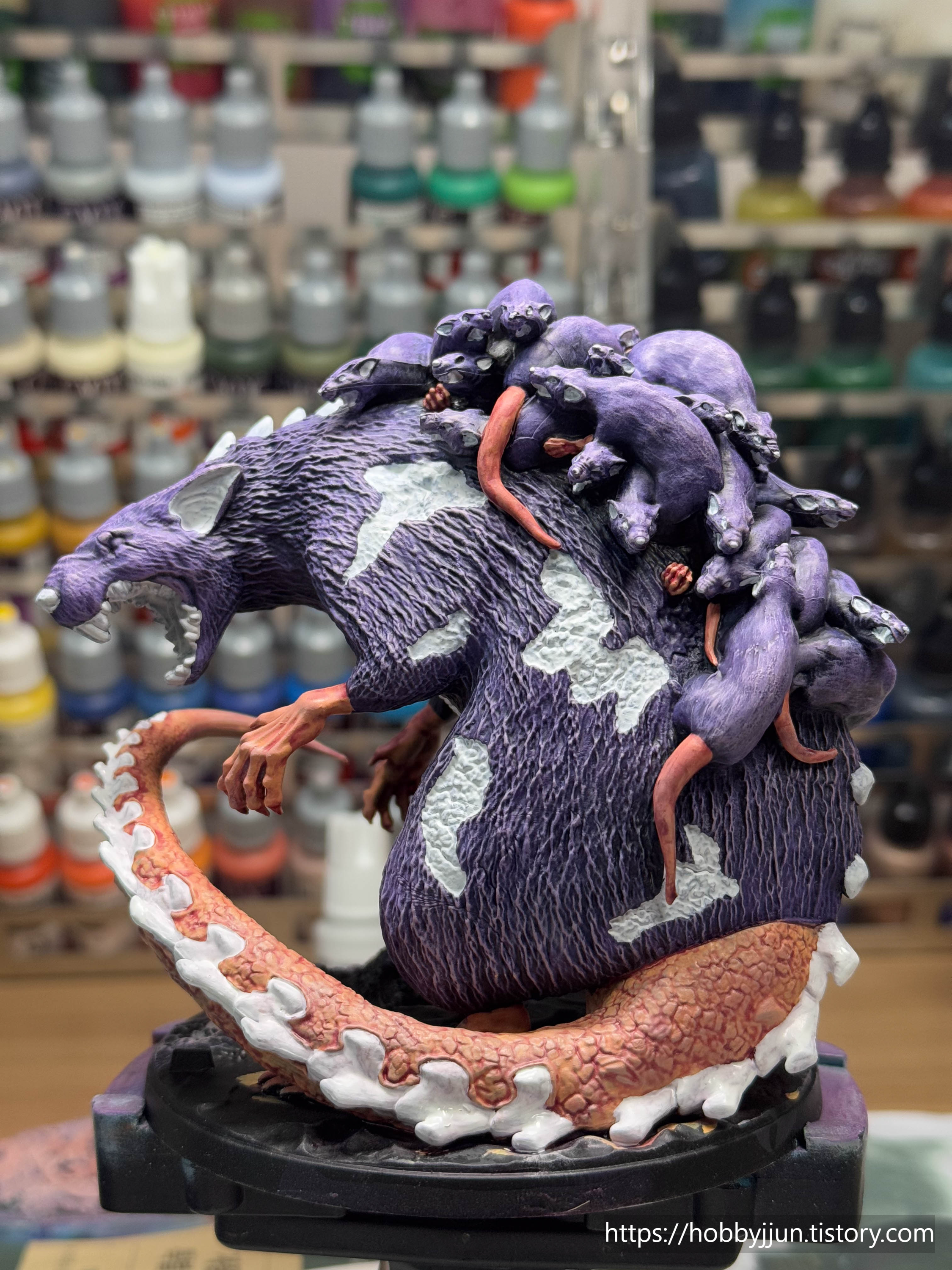 오쓰스원 1번 박스 보스 모델입니다. 새끼쥐들을 등에 업은 쥐 엄마(?) 컨셉의 모델입니다. 검은색 털로 칠할지 보라색 털로 칠할지 고민을 많이 했는데, 결과적으로는 보라색으로 칠했는데, 제