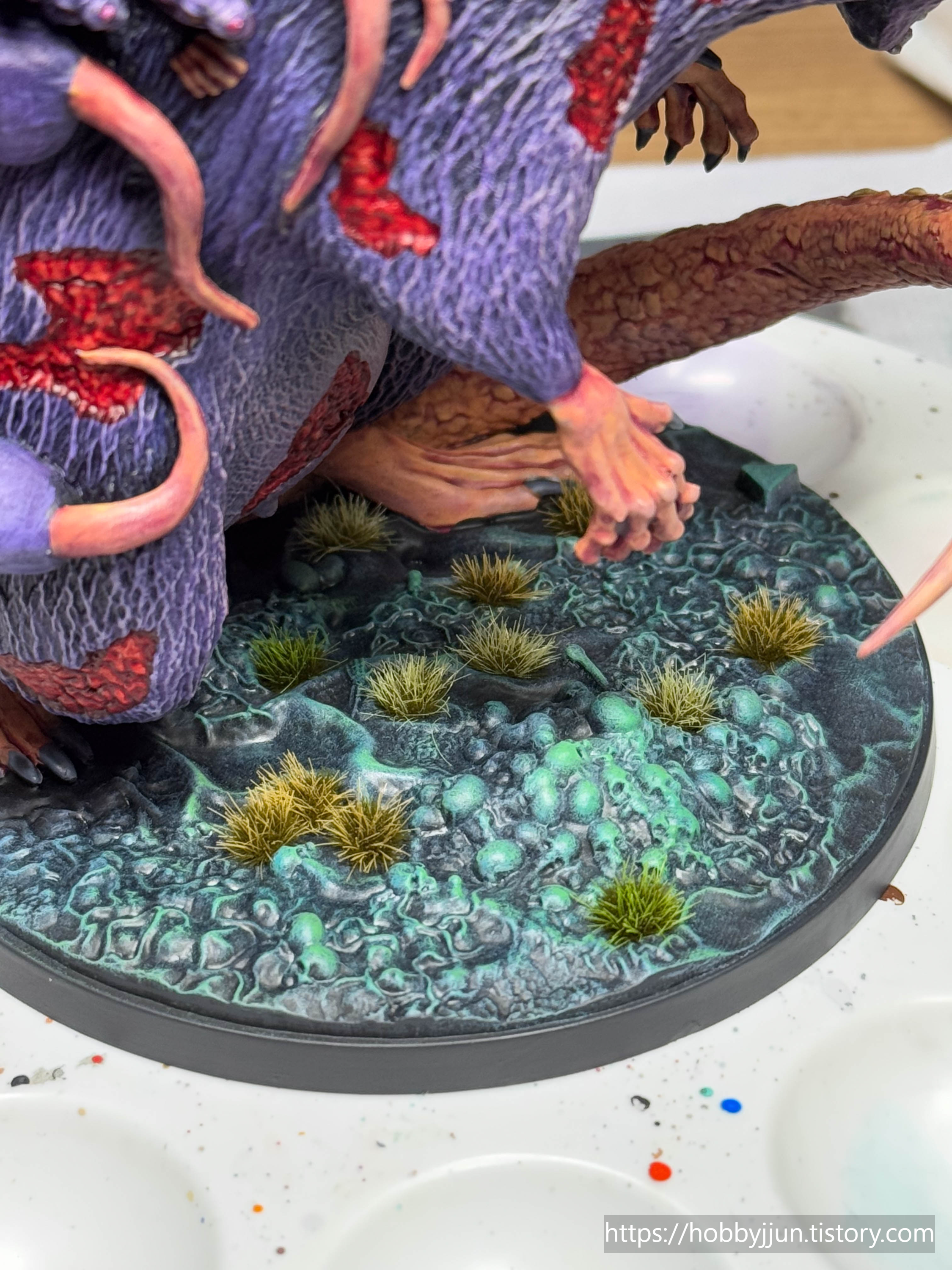 게임 박스 표지 메인 모델이기도 해서 제일 먼저 도색해본 보스모델입니다. 간만에 대형모델을 도색하니 작은 모델 도색하는 것과는 또다른 맛이 있었네요. 대형 모델은 전체적으로 드라이브러싱 위주로 칠하고, 이빨이나 눈, 작은 디테일들은 작은 붓으로 도색하는 방식으로 작업하면 조금 더 빠르게 도색할 수 있습니다.