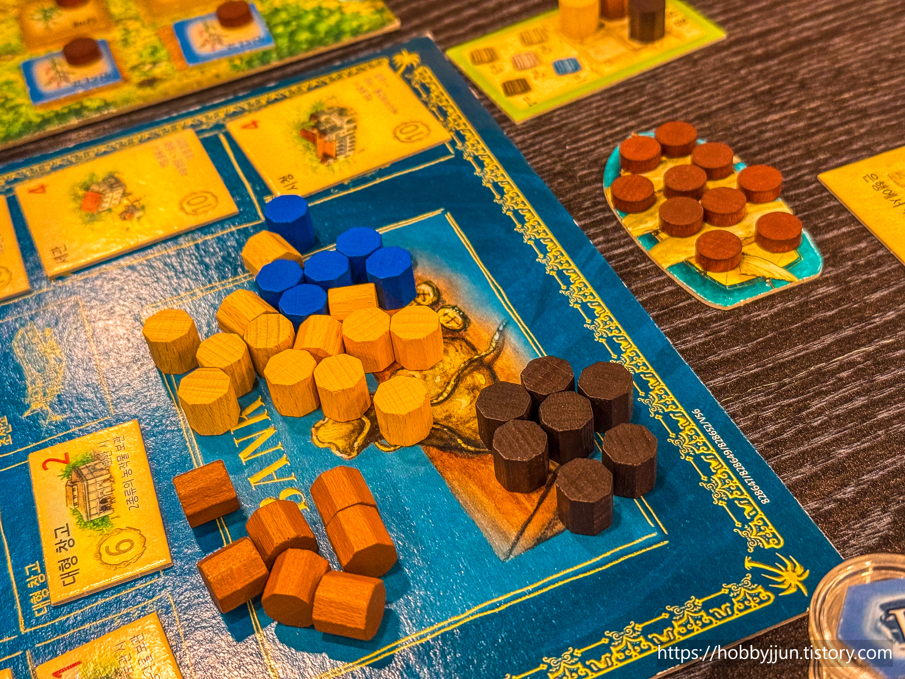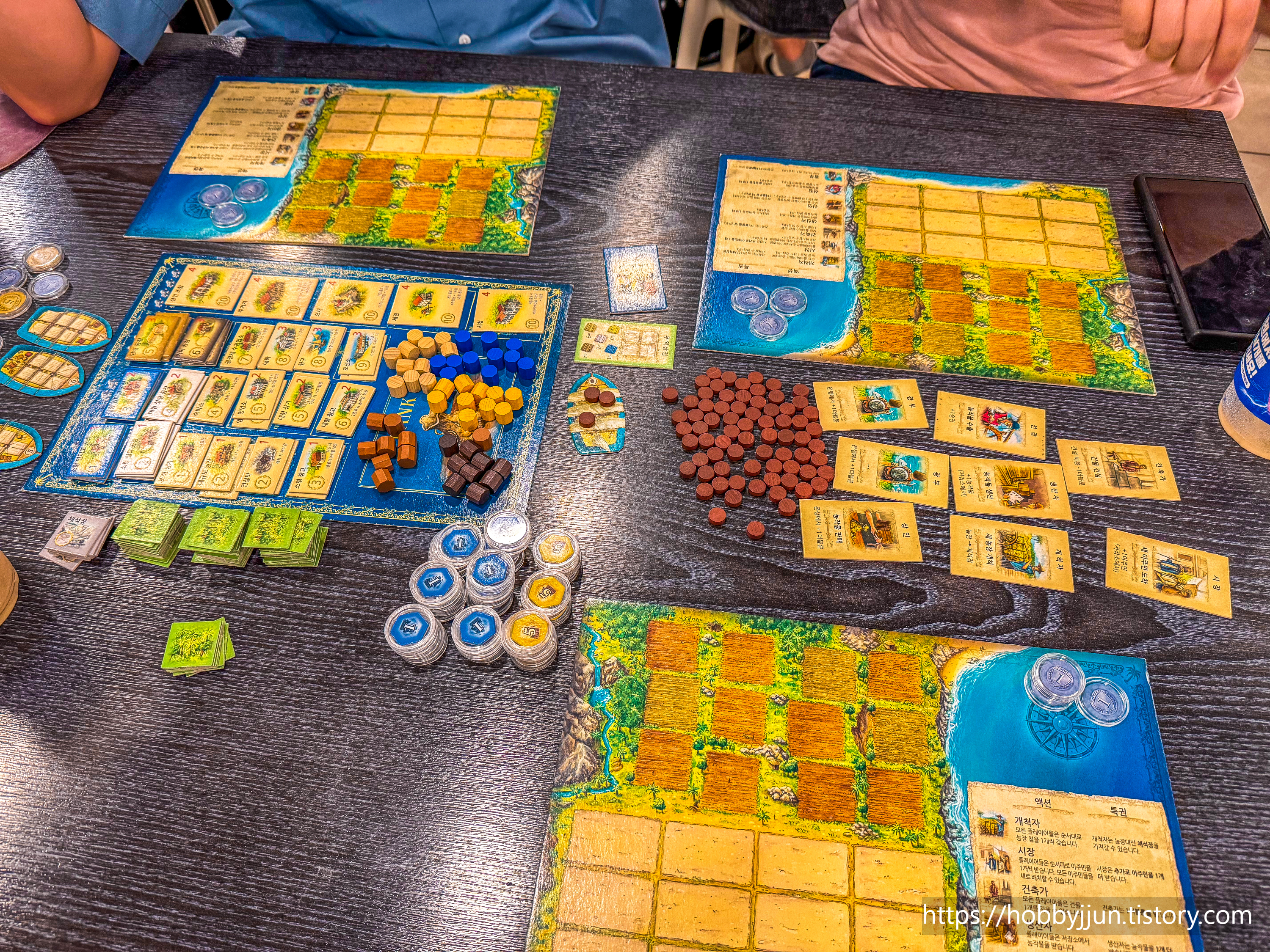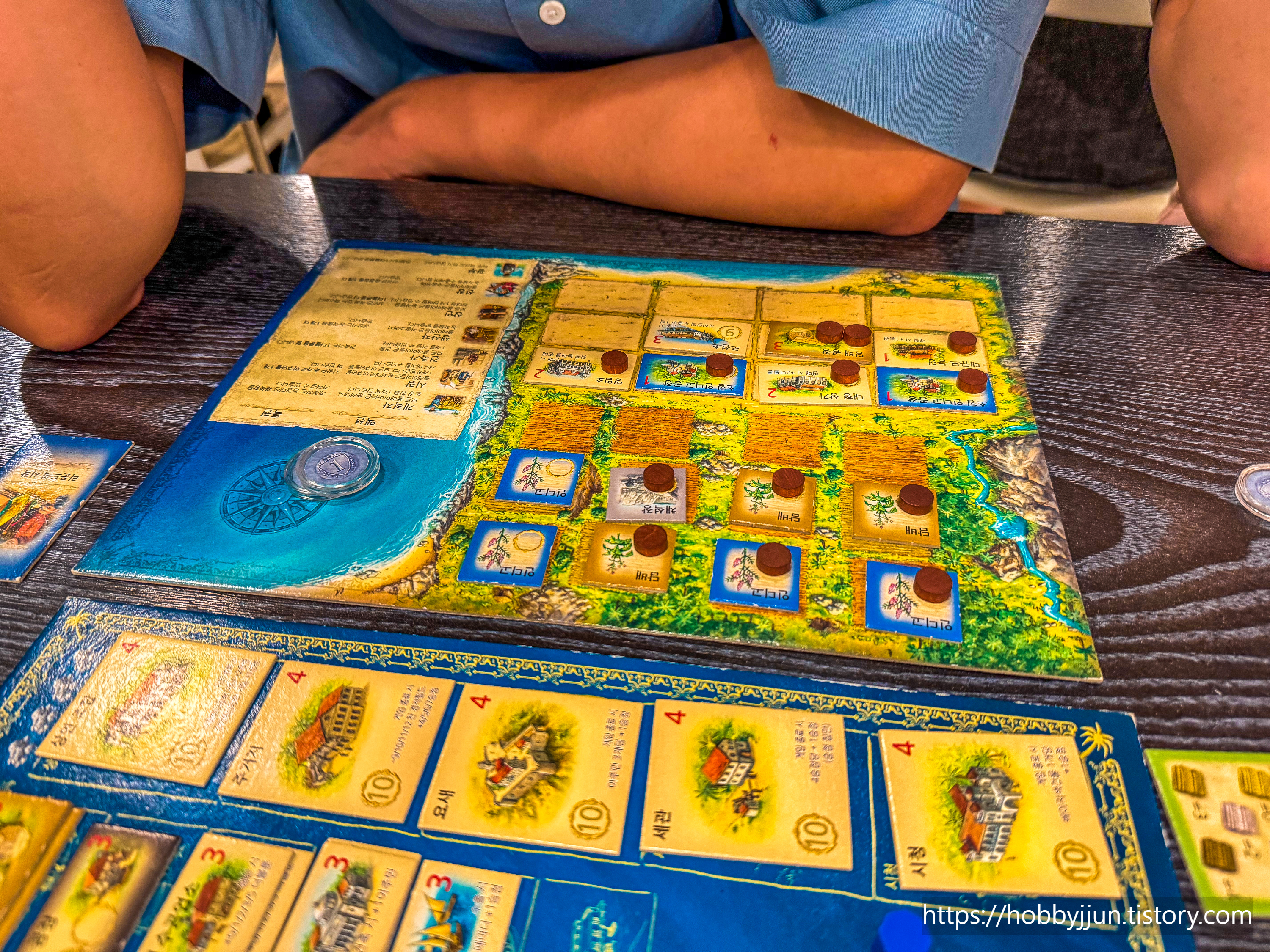 열심히 농장 짓고 물건 팔아서 건물을 늘린뒤 선적을 많이 해서 승점을 먼저 많이 가져가는 사람이 승리합니다 ㅎㅎ