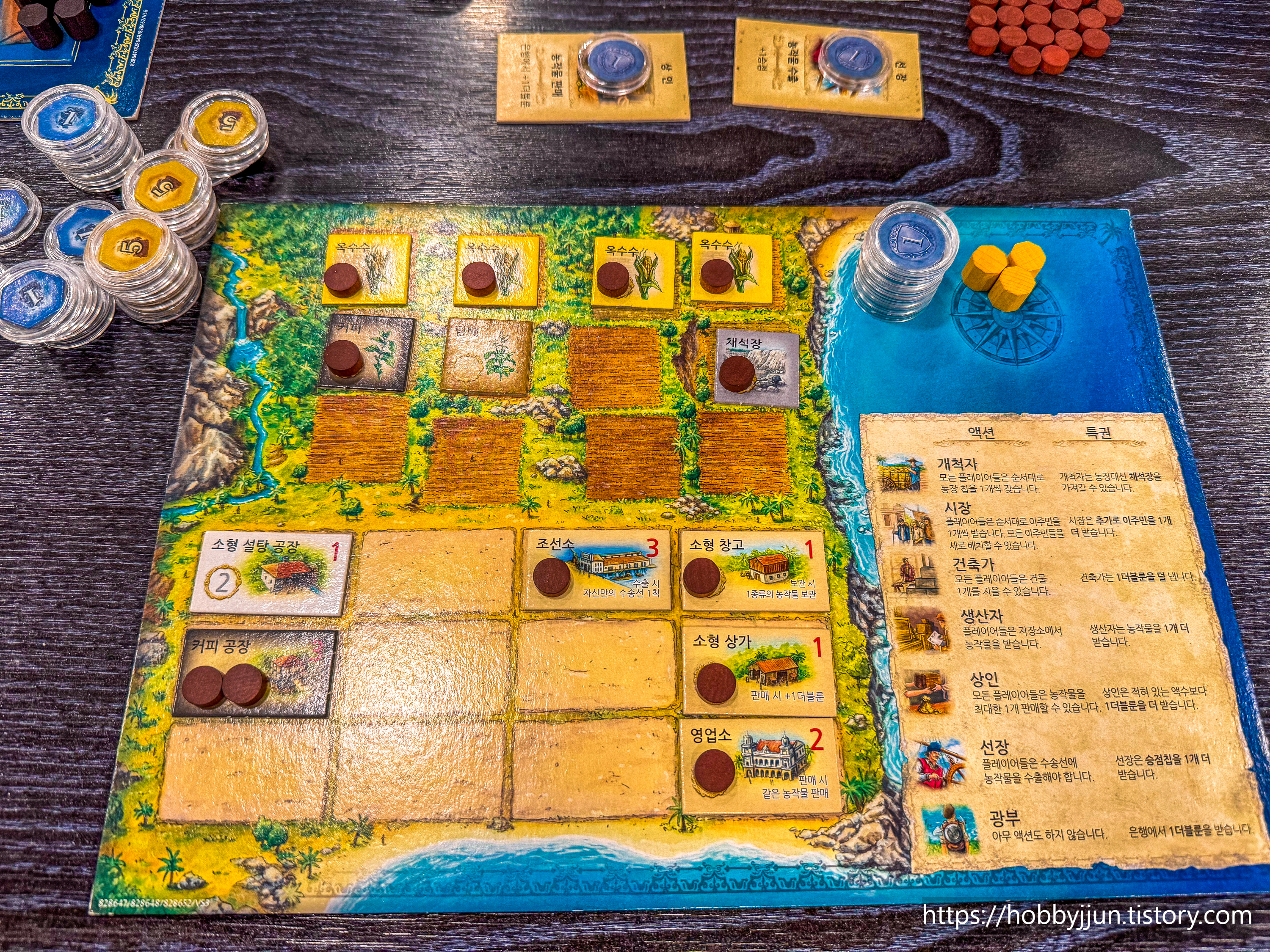 선택할 수 있는 행동이 7가지로 크게 복잡하지 않고, 건물의 능력만 간단하게 숙지하고 있으면 게임이 크게 어렵지는 않습니다.