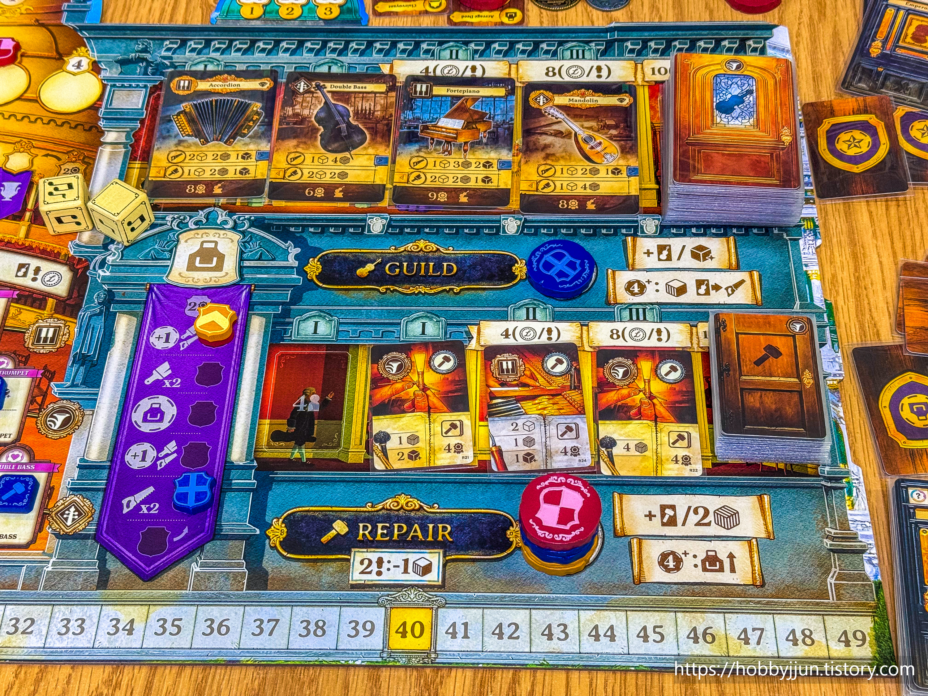 악기 카드를 가져오는 액션에 5 / 5 / 3의 일꾼이 배치되었던 모습