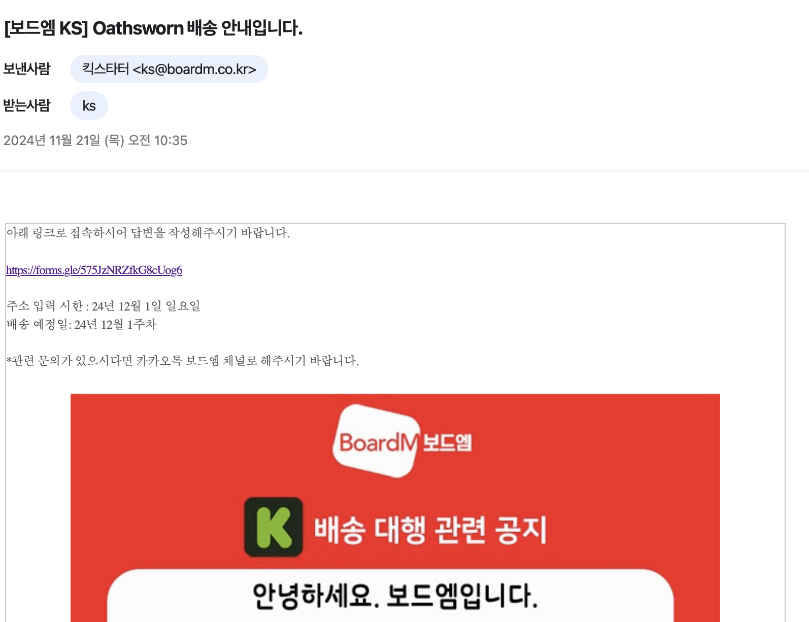 그리고 마침내 인고의 시간 끝에! 3주만에 VFI를 통해 배송한다고 보드엠에서 한국 주소를 넣으라는 이메일이 왔네요 ㅎㅎ