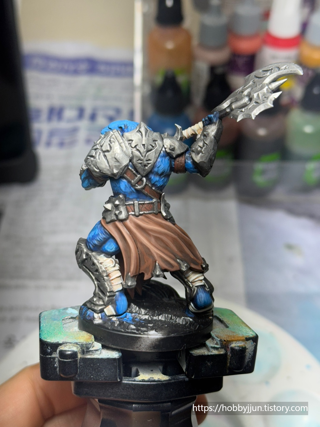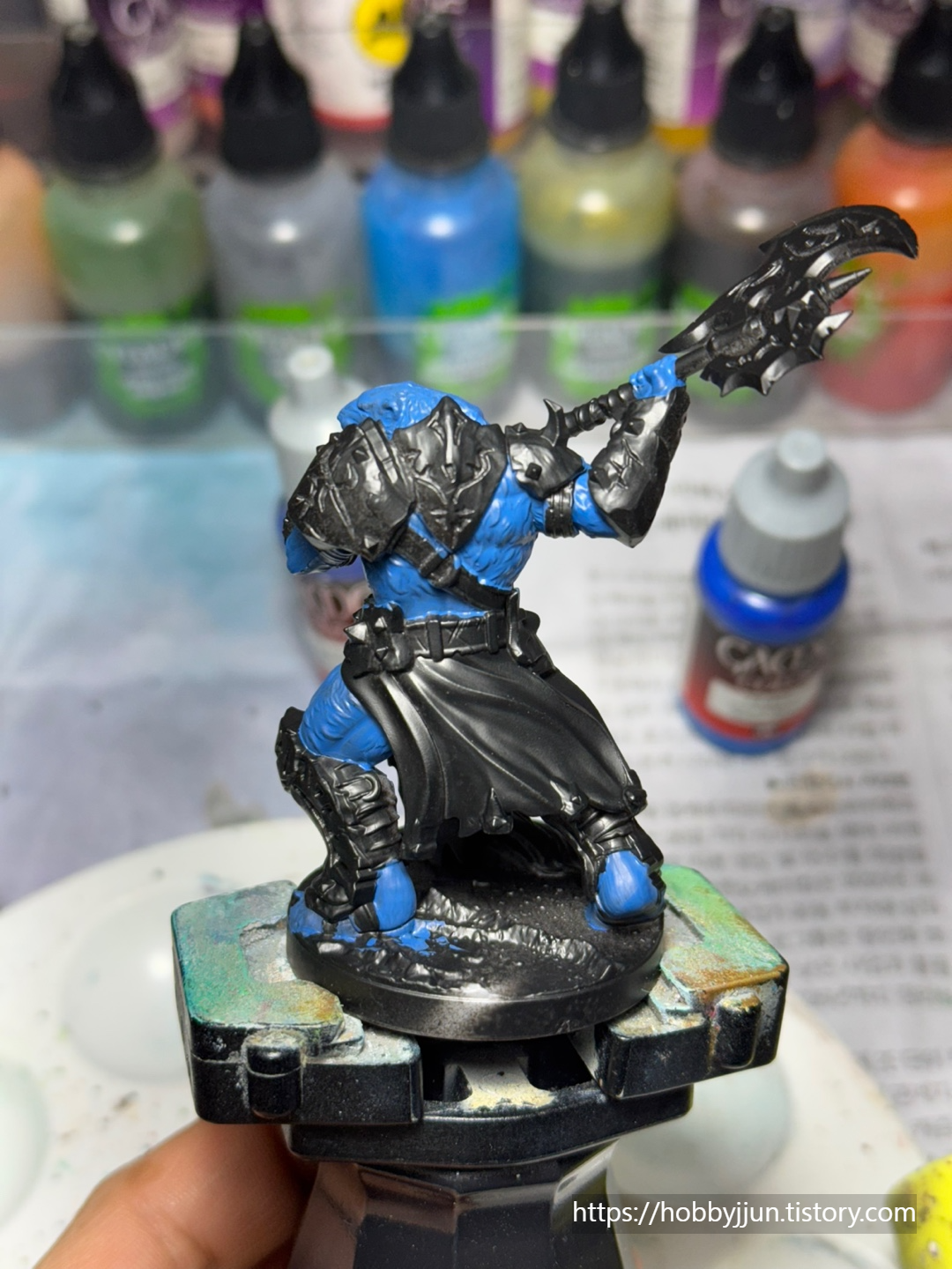피부는 베이스 색인 Heavy Blue를 다시 전체적으로 발라주고, 튀어 나온 부분에 조금 더 밝은 파란색을 면적을 줄여가며 발라줍니다.