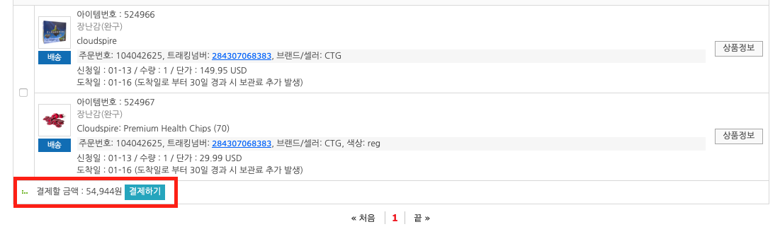 결제대기 상세를 들어가보면 결제해야할 배송 금액이 표시되어 있습니다. 54,944원이네요. 대략 $38 정도 입니다.