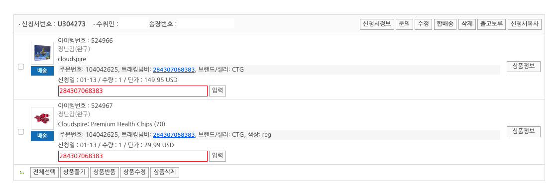 어제 작성했었던 배송 대행 사이트에서 메일로 받은 트래킹 번호를 업데이트 해줍니다.