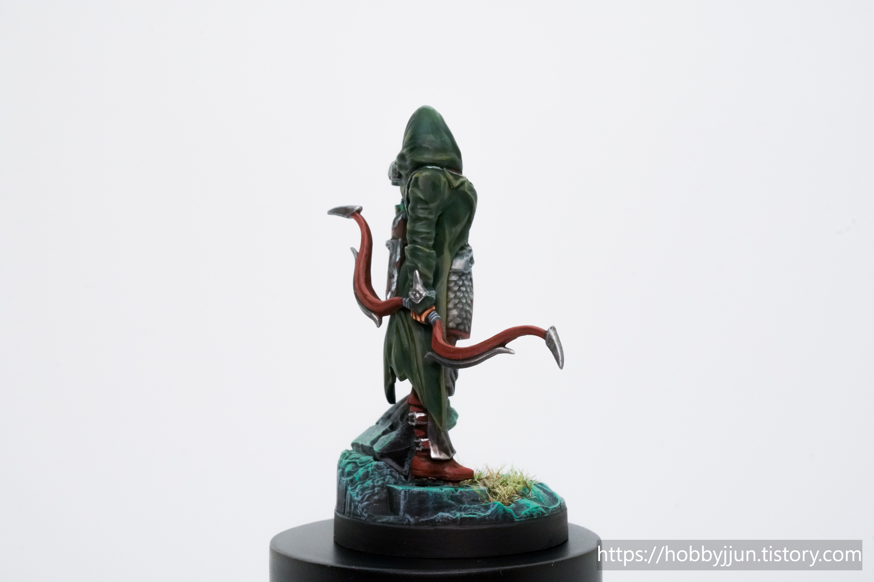 5번째로 도색한 모델은 Huntress 입니다. 엘프 궁병 느낌이 나는 모델입니다. 검은색 프라이밍 상태에서 시작합니다. 숲속에서 활동하는 궁병 컨셉을 주기 위해서 망토는 초록색으로 칠하기로 합